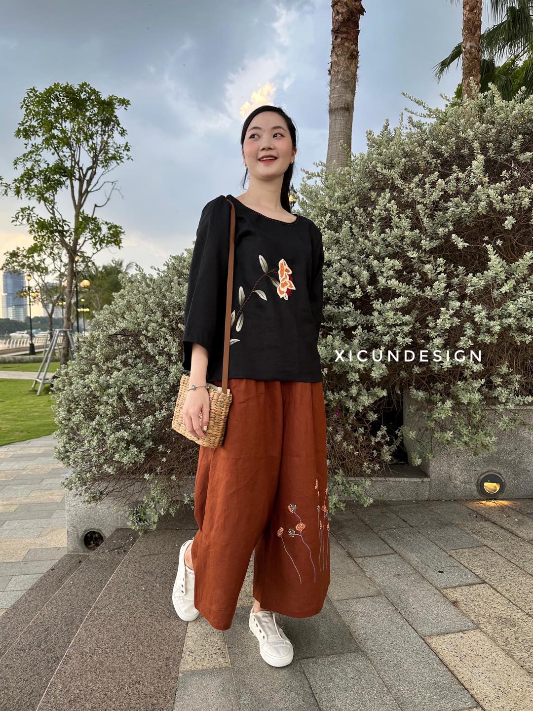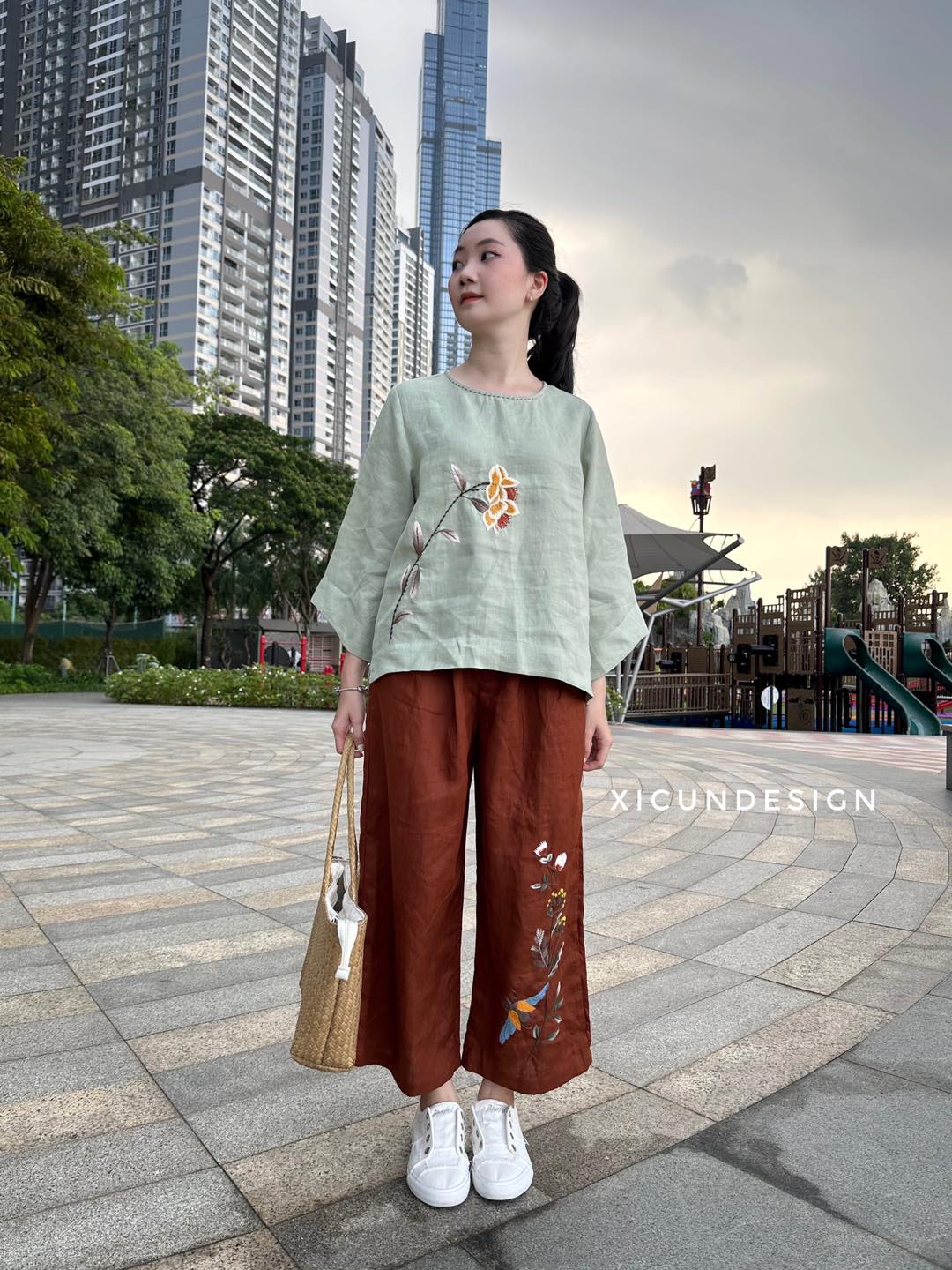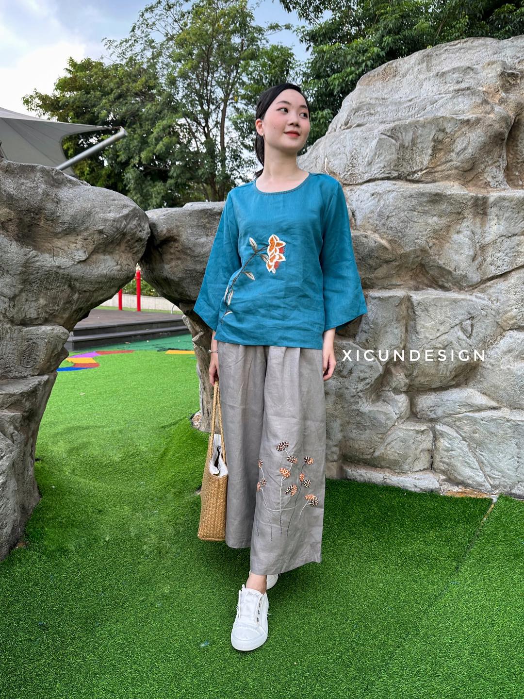 - Kiểu dáng: Áo cổ tròn, tay dài hơi loe, thêu tay