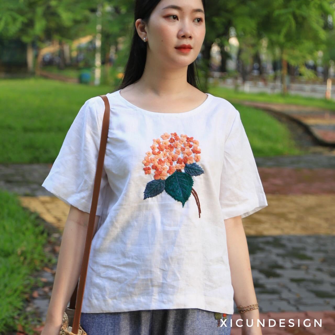 - Kiểu dáng: Áo cổ tròn tay ngắn, thêu tay