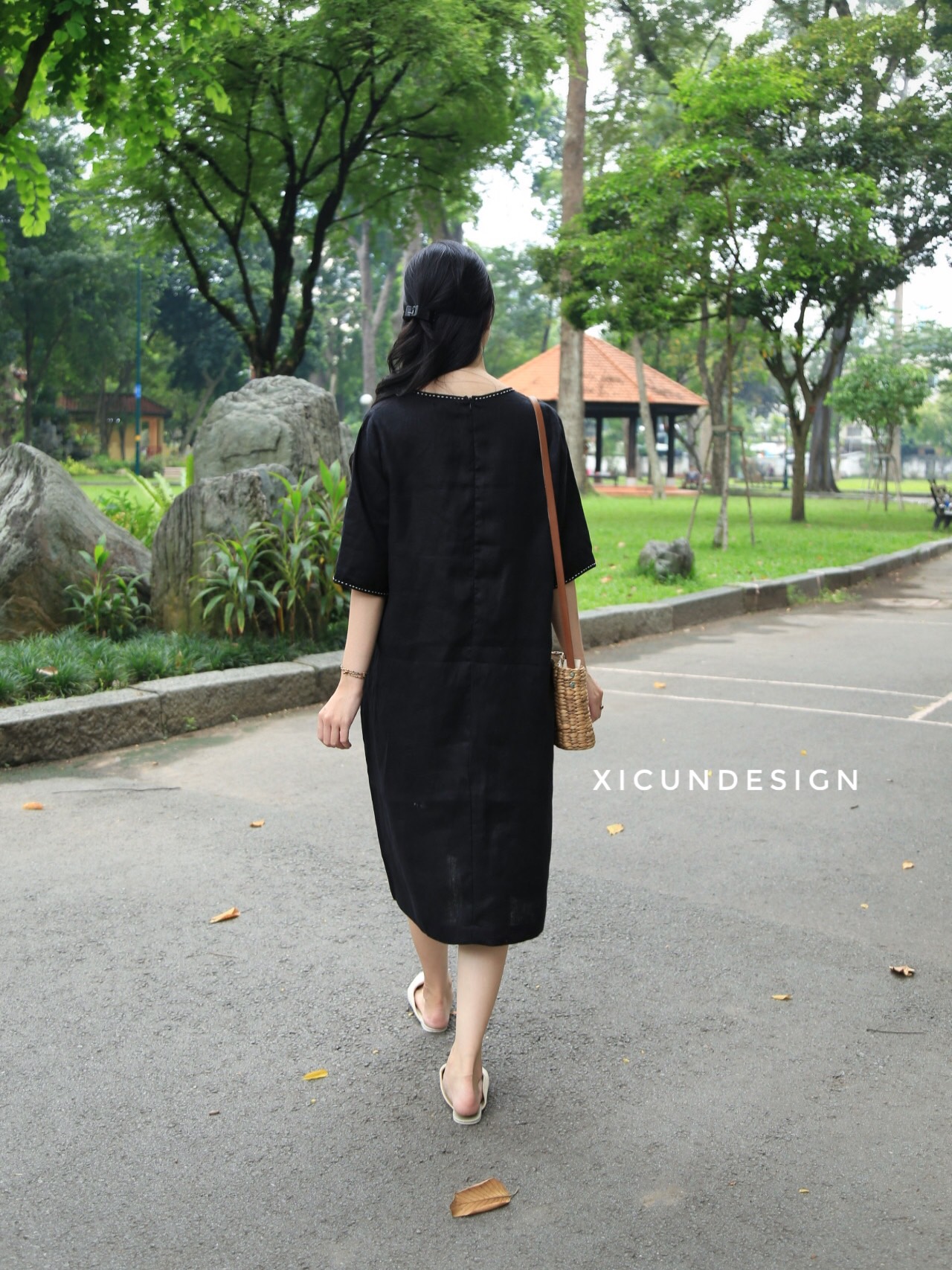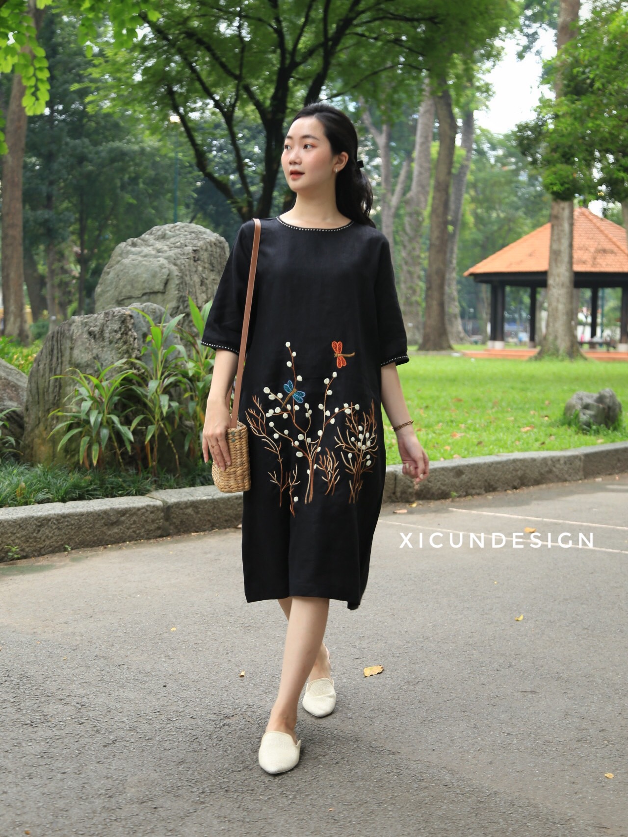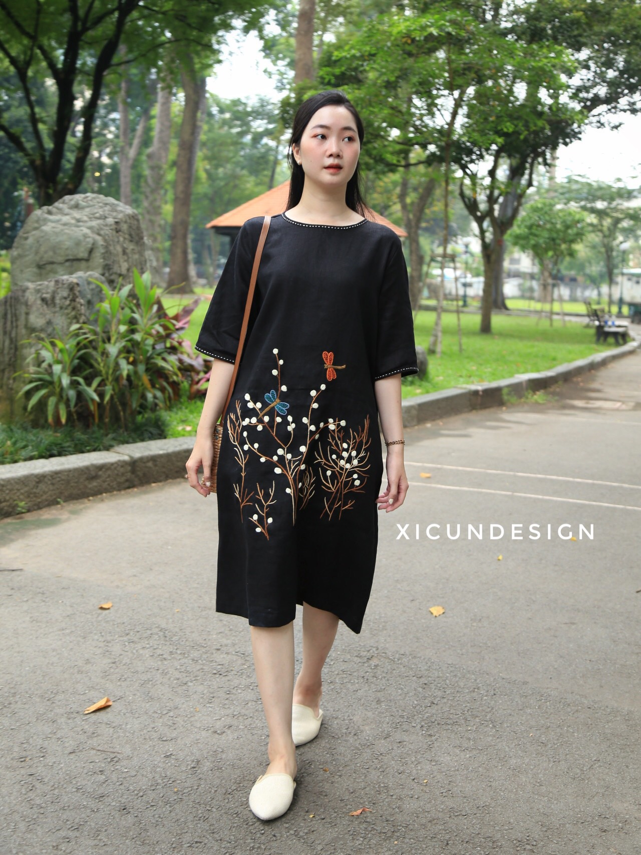 - Kiểu dáng: Đầm suông, tay ngắn, thêu tay