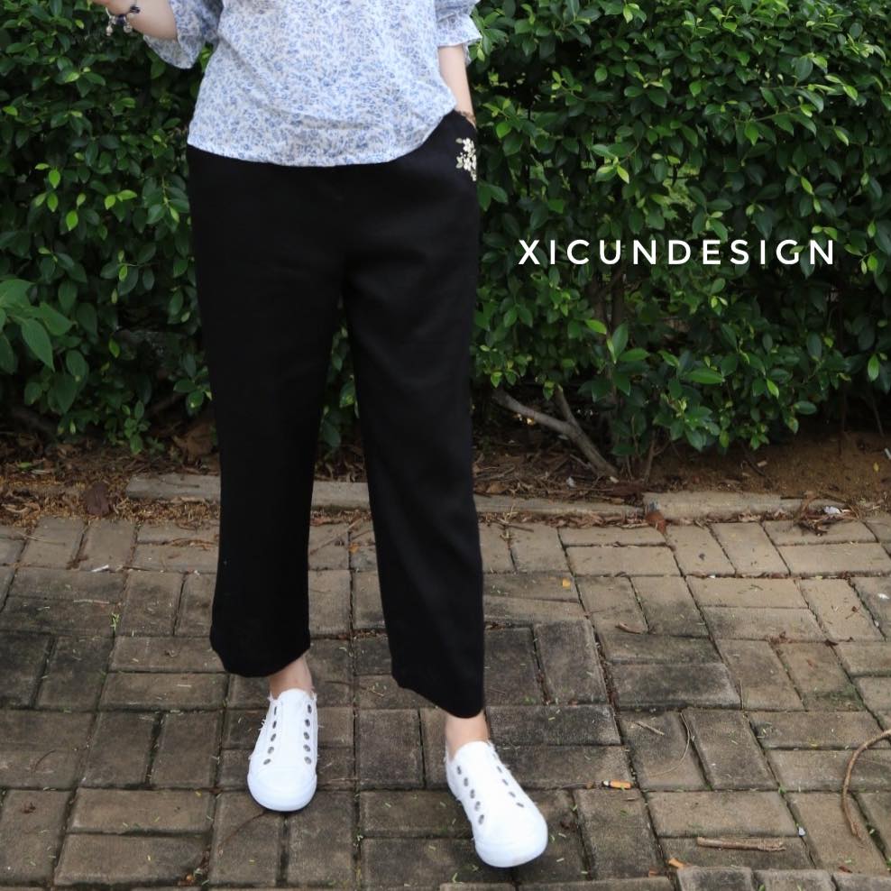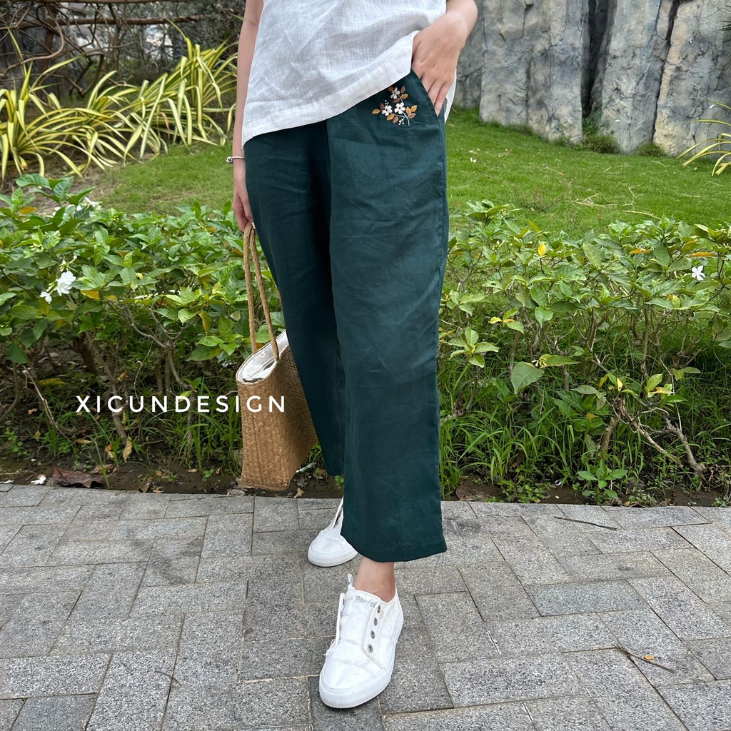- Kiểu dáng: Quần suông, lưng thun, thêu tay